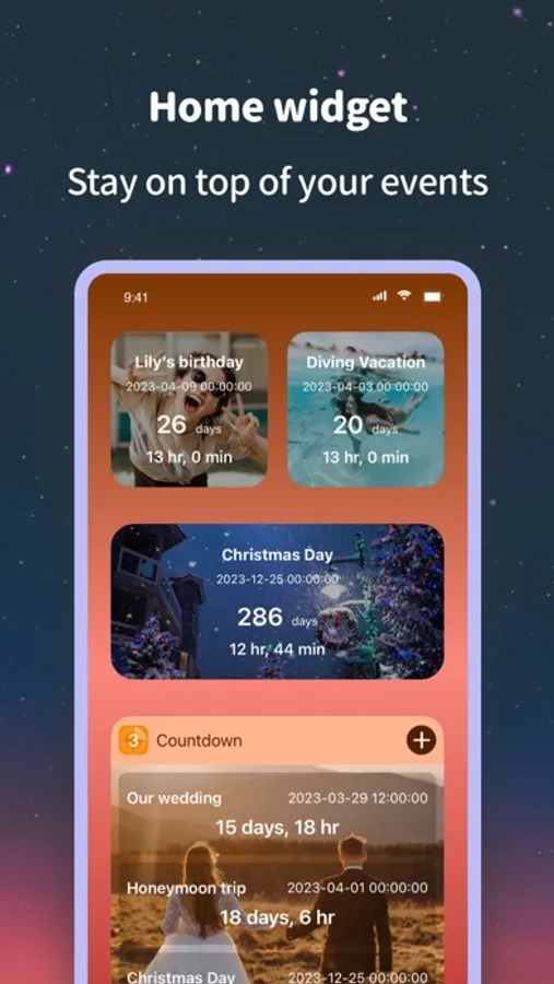 • Home widget: Keep track of your countdowns with a beautiful and informative widget on your home screen.
