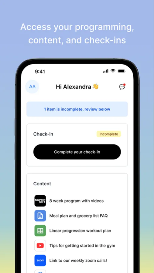 Superset connects clients with their coaches in one easy to use app. Enjoy automated client onboarding, training and programming, in-app messaging, and check-in forms.