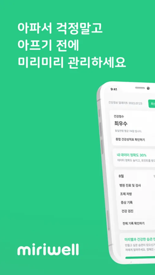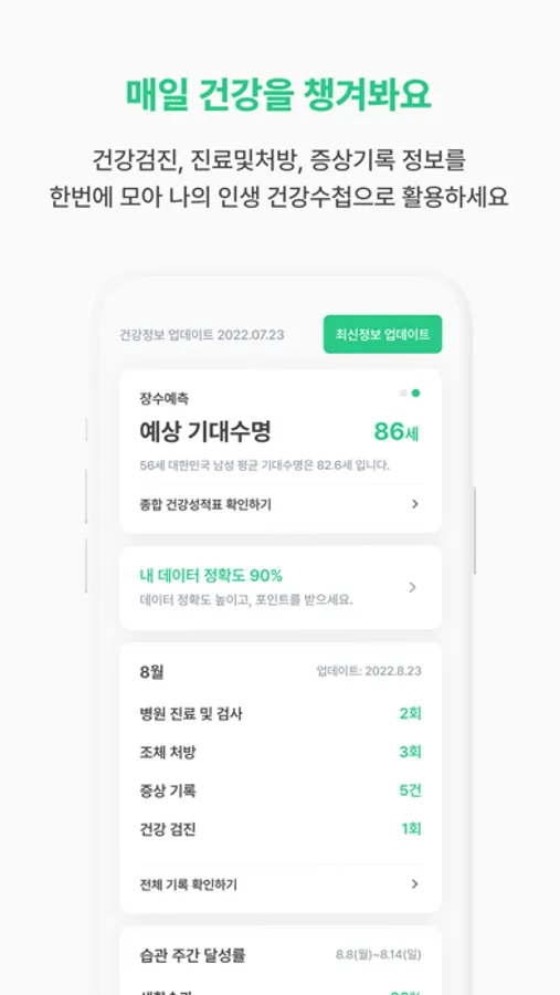 건강검진, 진료및처방, 증상기록 정보를 한번에 모아 나의 인생 건강수첩으로 활용하세요.