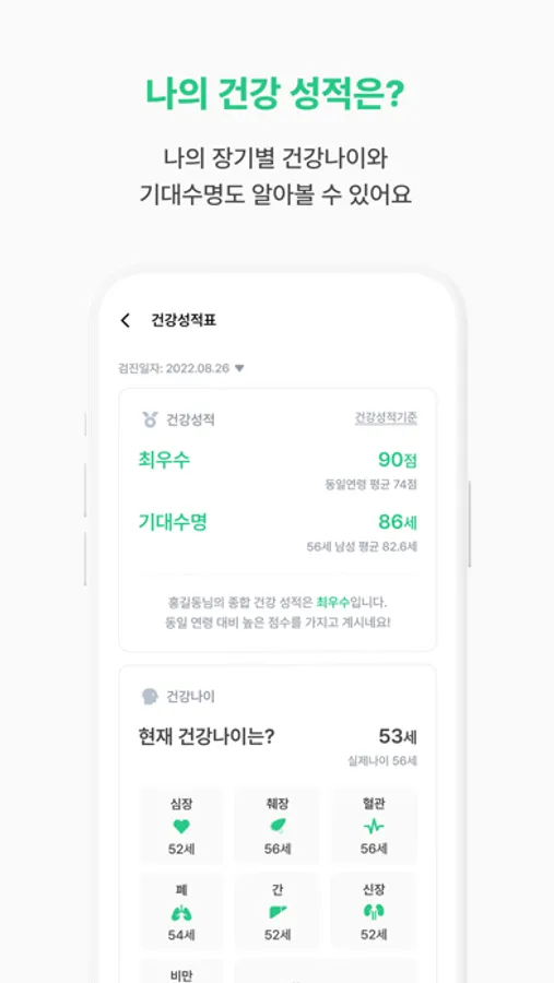 나의 장기별 건강나이와 기대수명도 알아볼 수 있어요.