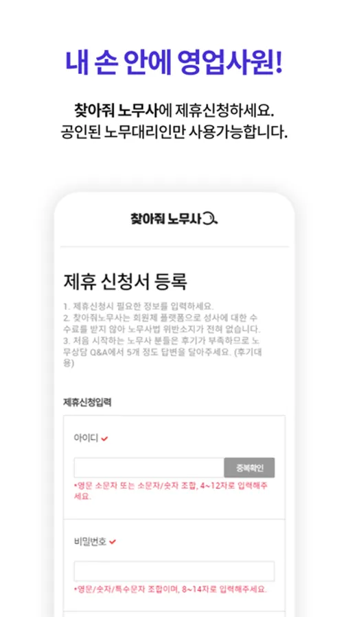 1. 노무사분의 제휴신청서를 작성해주세요. 사업자등록증 반드시 첨부해야합니다.