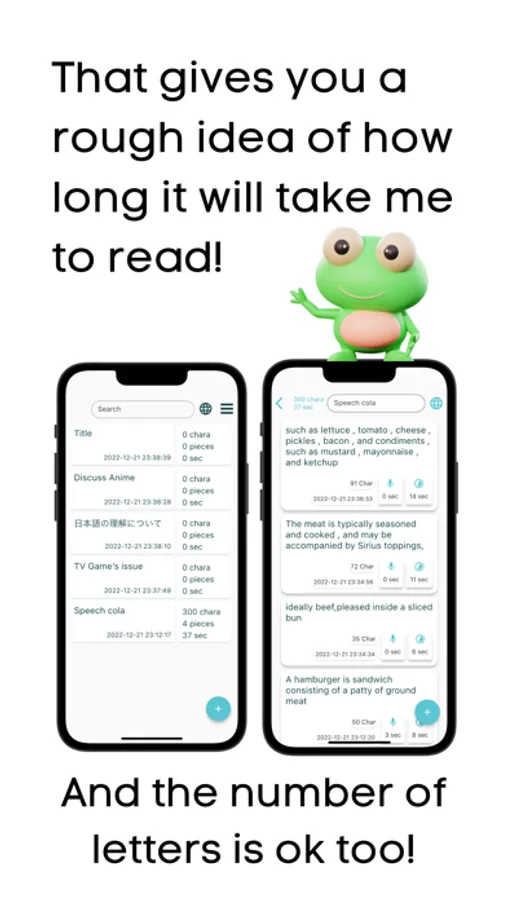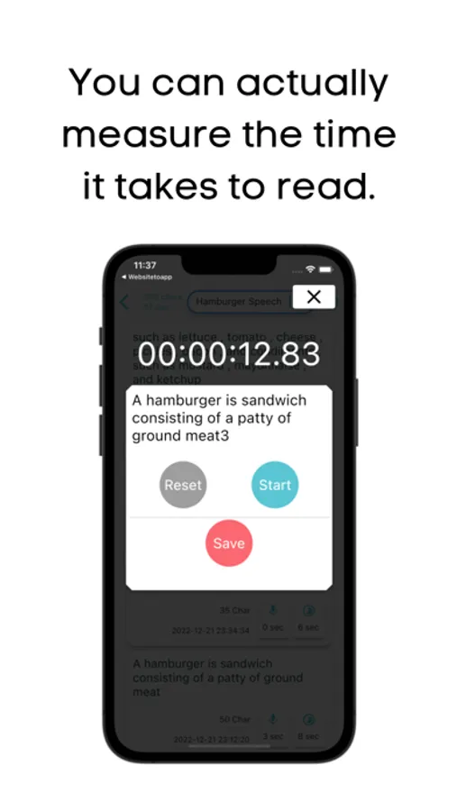 I used this app when I was having trouble keeping my presentation time under 10 minutes due to a time limit at my university. This app shows you roughly how many seconds it will take. You can also record how many seconds it took you to actually read it. I write notes to get a rough idea of how many seconds it will take, and then use the timer to record the detailed speed of my reading. Since using this app, I have been able to assemble my presentation much faster and have made no mistakes in going over time.