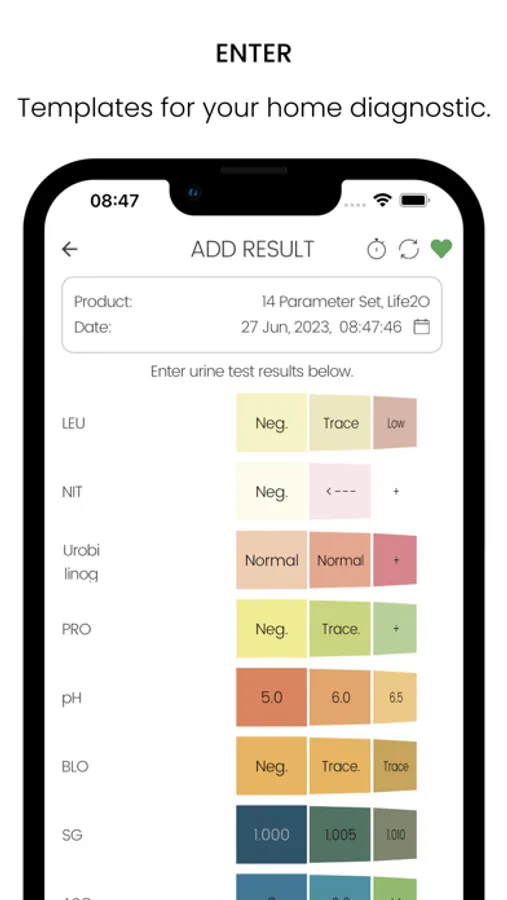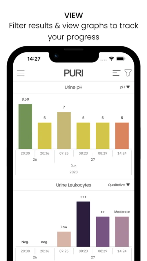 Enter your test results and view a graph, or individual results. PURI is perfect for people who take regular urine tests.