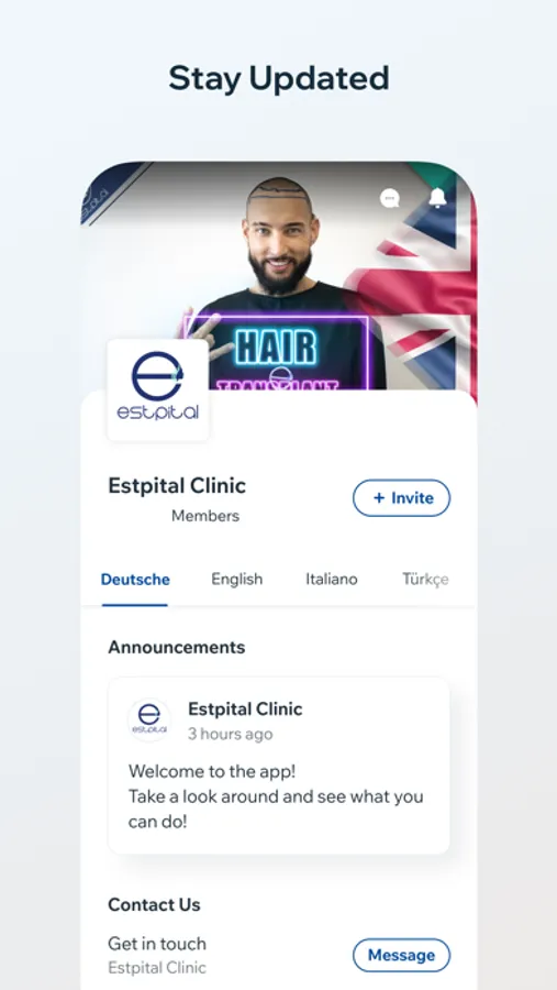 The mobile application of Estpital International Clinic. Thanks to this application, you will be able to use many functions such as pre-operative information about hair transplantation treatments, operation processes and post-operative follow-up, sharing experience with other people, and process follow-up.