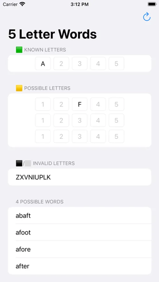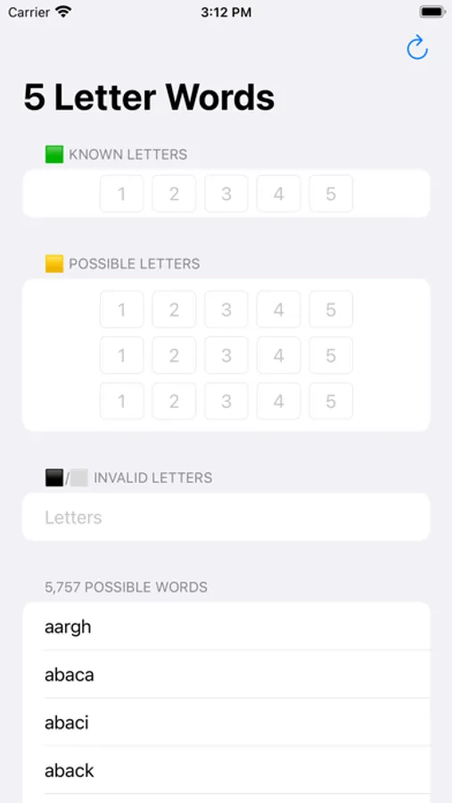 Helps you find 5 letter words for popular online games. Simple enter known, possible, and invalid letters. Then as you type, the list of possible answers will shrink.