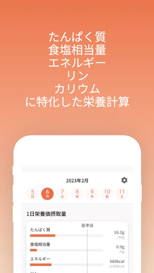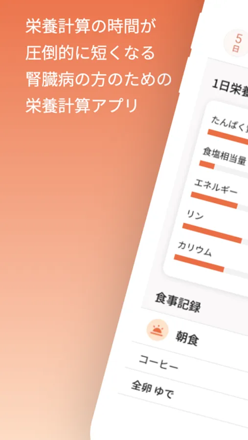 ・今までタンパク質と塩分の把握だけでいっぱいいっぱいでカロリー計算までしていませんでした。アプリのおかげで必要なカロリーが1/2しか摂れていないことが把握できました。とても大事な気づきができて助かりました。制限のある項目だけに焦点を当ててしまう人は他にもいると思うので、腎臓に関連する項目が一気に把握できることはありがたいです。