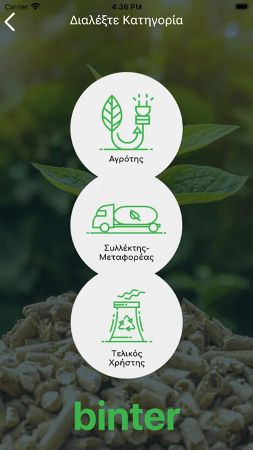 2. Selects the user category (farmer, collector/transporter, end-user).