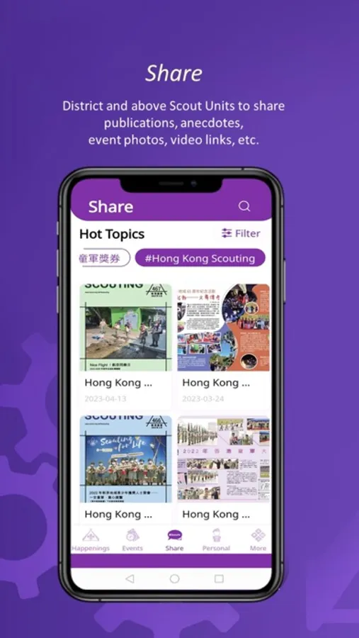 Obtain unique information from ""Hong Kong Scouts"" App, including sharing of photos, interesting articles and short video links. Click on #Hashtag to browse related information.