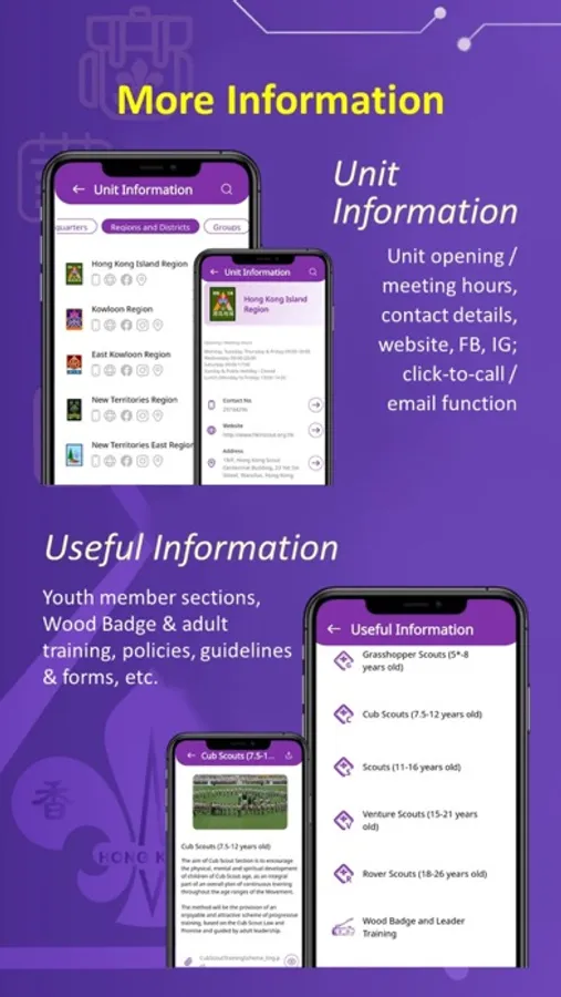 Unit Information : Provide Units' contact information where you can filter Headquarters Units, Regions and Districts, Groups, Subsidiaries, Facilities and Campsites. Information includes sponsoring authority, opening/meeting hours, contact information (telephone, email, website, Facebook, IG and Google Maps showing address). Provide one-click call / email function.