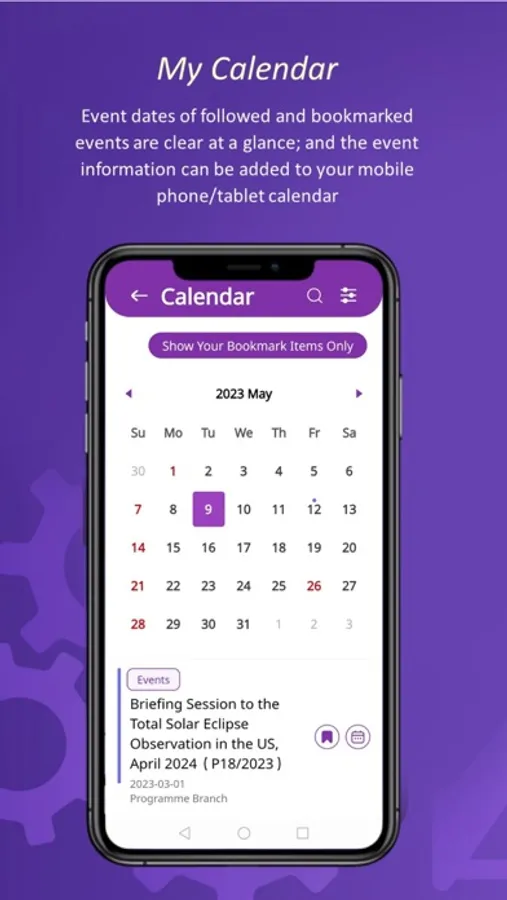 My Calendar : The dates of followed and bookmarked events can be displayed and you can add events to the calendar of your phone/tablet