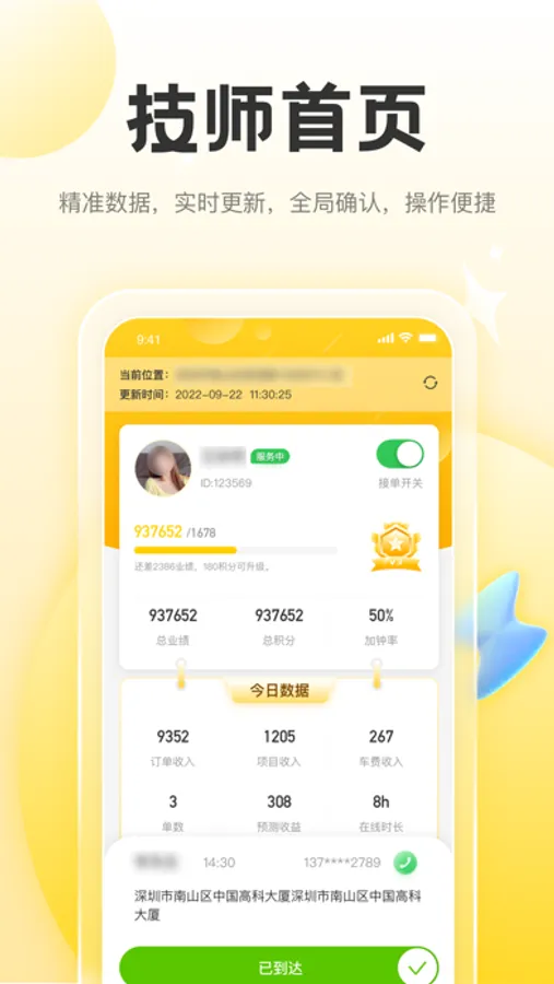 技师版为技师提供一键接单,方便快捷。您可以随时随地接单、查看日程、跟踪预约情况,记录客服信息,可以查看订单收入、提现等功能。还提供数据统计和分析功能,可以帮助技师更好地了解自己的业务情况,并做出决策。