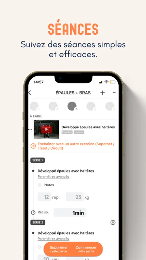 Chaque exercice est expliqué avec une vidéo explicative (+ de 500 exercices vidéo) du mouvement, le nombre de répétitions à faire, la charge à utiliser ainsi que le temps de repos à prendre.