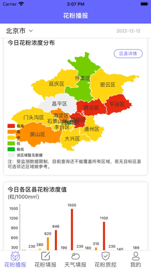 花粉播报App是一款支持花粉数据填报的移动端产品,支持各个监测点单独进行花粉数据填报、天气填报、花粉质控处理、可查看各个城市、区县花粉浓度详情及近7天变化趋势等。