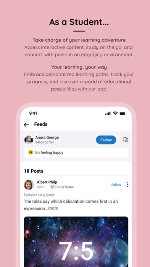 • Share unique ideas, suggestions and engage in discussions with teachers, students, parents using Feeds.