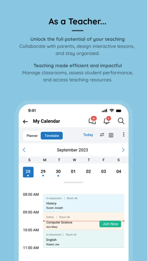 • Keep track of your classes, live sessions, and other school events with our app - and teachers can use it to mark attendance, track behaviour, and monitor academic progress.
