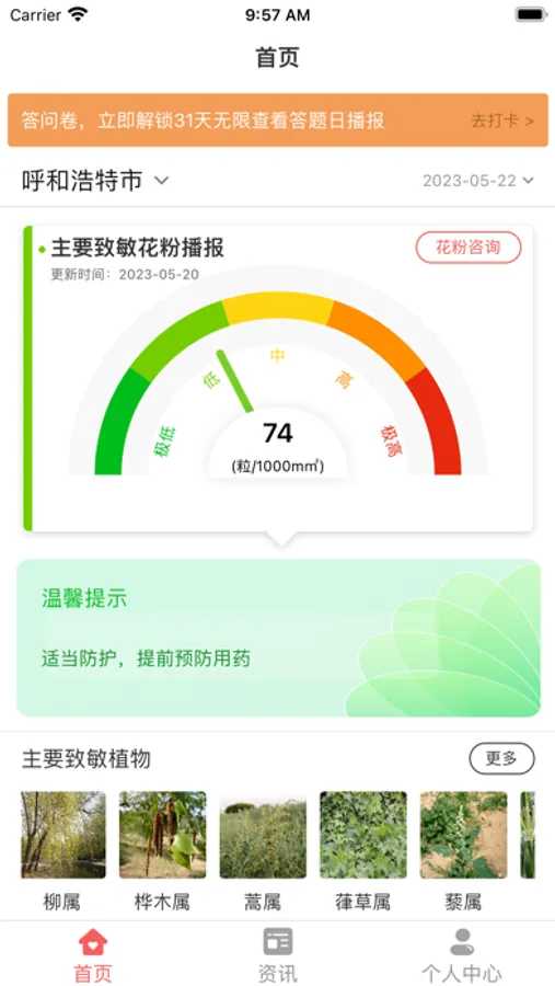花粉日播报App支持查阅当天花粉浓度及分布情况,支持花粉问题咨询,可查阅当日主要致敏植物信息,支持打卡后解锁查询历史花粉数据,支持分城市、区县查看各个区域花粉浓度详情及近7天变化趋势等。