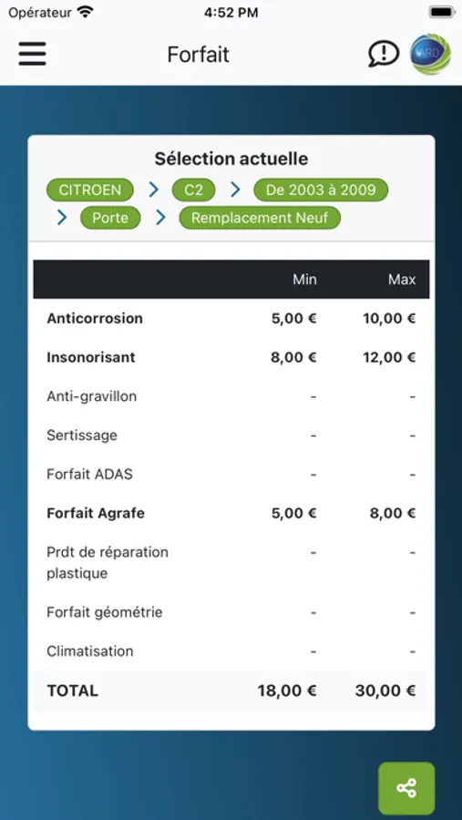 Celle-ci permet, via un téléphone ou une tablette, de chiffrer, directement sur le terrain, les différents forfaits utilisés dans la réparation automobile, ceci en fonction du véhicule, de sa marque, de son modèle et de différents scenarios.