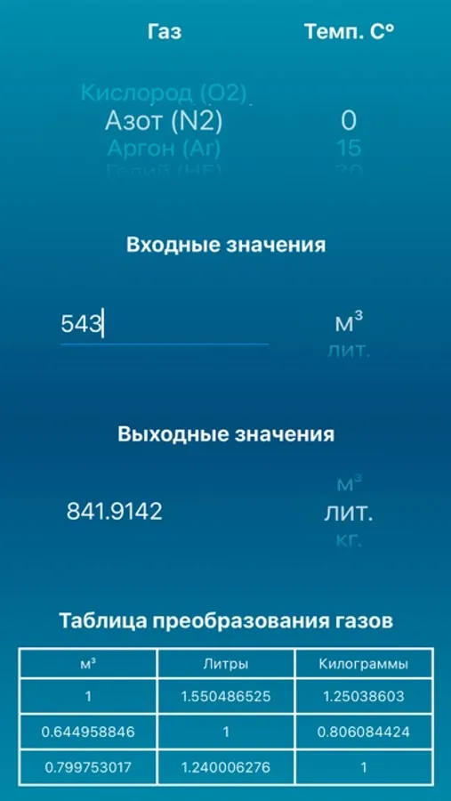 Отображается таблица для "ручной" конвертации газов. Есть выбор температуры газа.