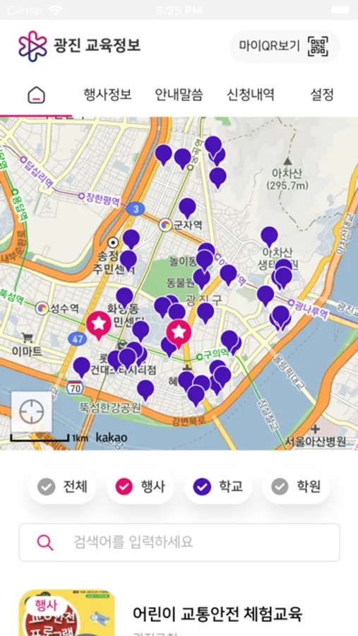 서울시 광진구의 학교 및 학원 그리고 교육관련 행사 정보를 지도기반으로 한눈에 볼 수 있습니다.