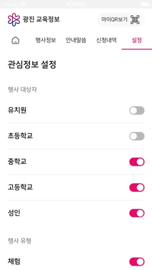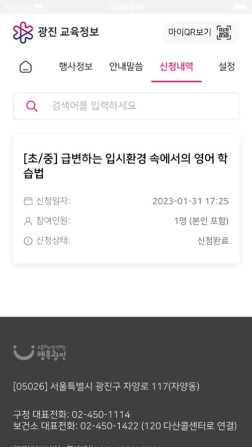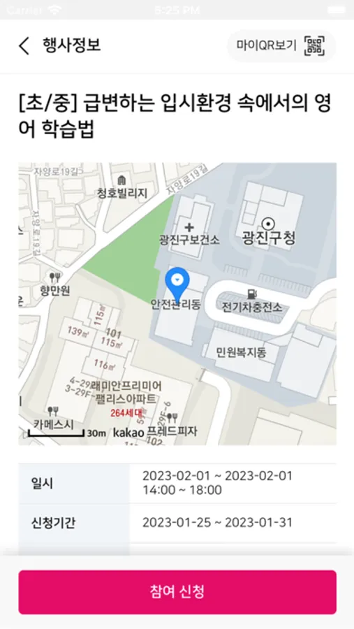 행사정보의 경우 바로 참여신청이 가능하며 앱을 설치만 하면 자동으로 부여되는 큐알코드를 이용하여 행사장에 입장 할 수 있습니다.