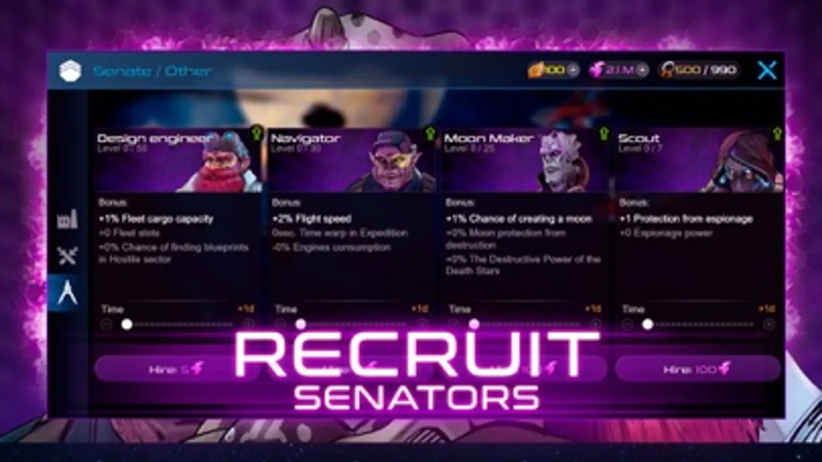 Xterium offers a modernization center where players can improve their warship craft and defense by completing contracts and sending their fleet for a unique revision. Talented craftsmen can add new types of combat weapons to ready-made ships, increase the recovery of shields, or add a double-shot and shield module, depending on the player's strategy. By studying attack, armor, and shields, players can increase the combat power of their spaceship.