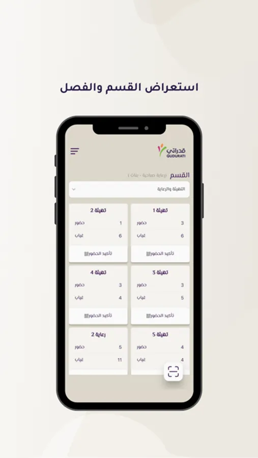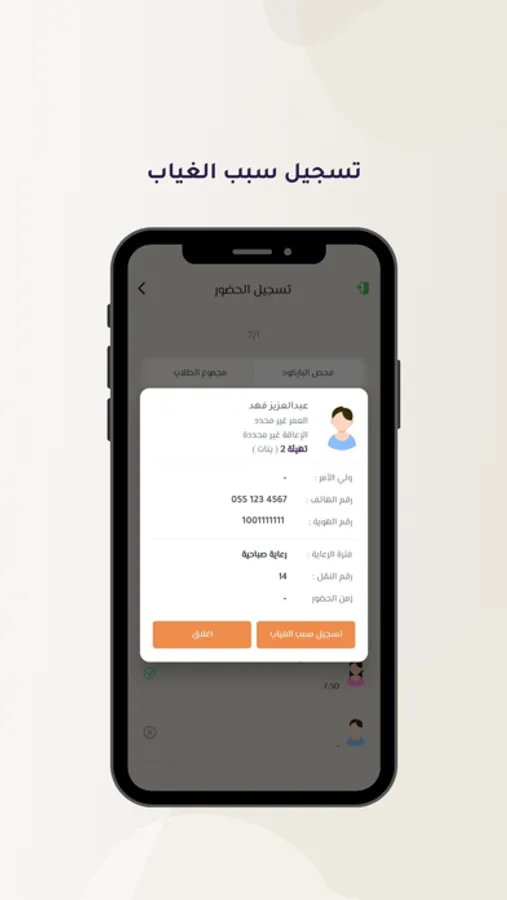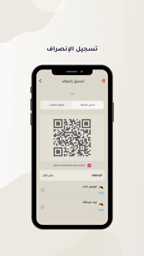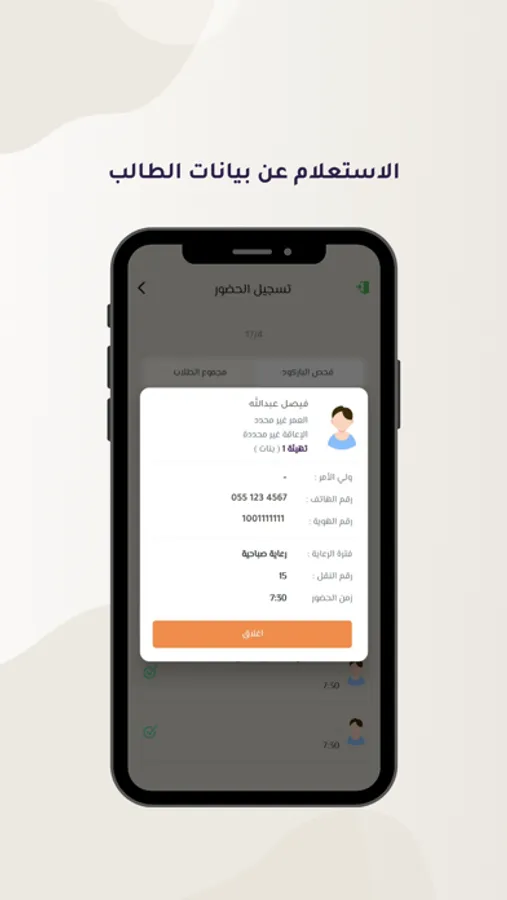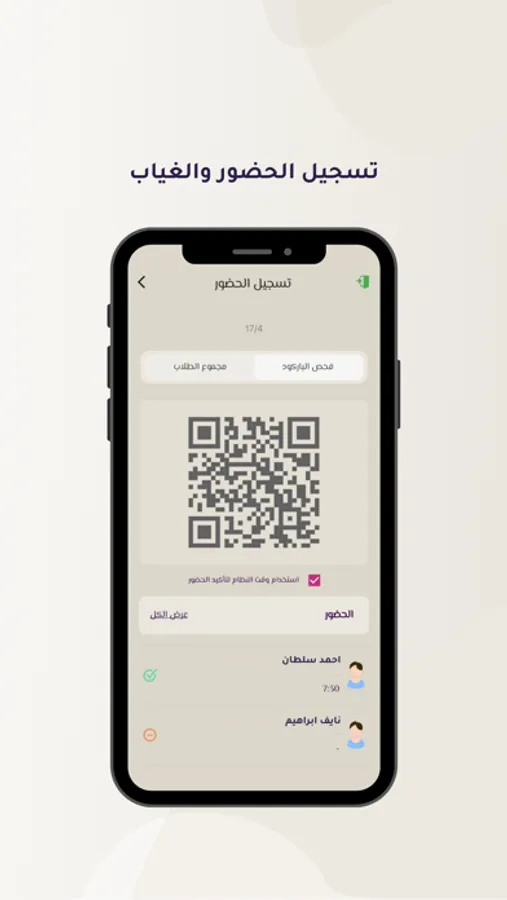 يتيح التطبيق إمكانية تحضير الطلاب والاستعلام عن بيانات طالب معين عن طريق الباركود.
