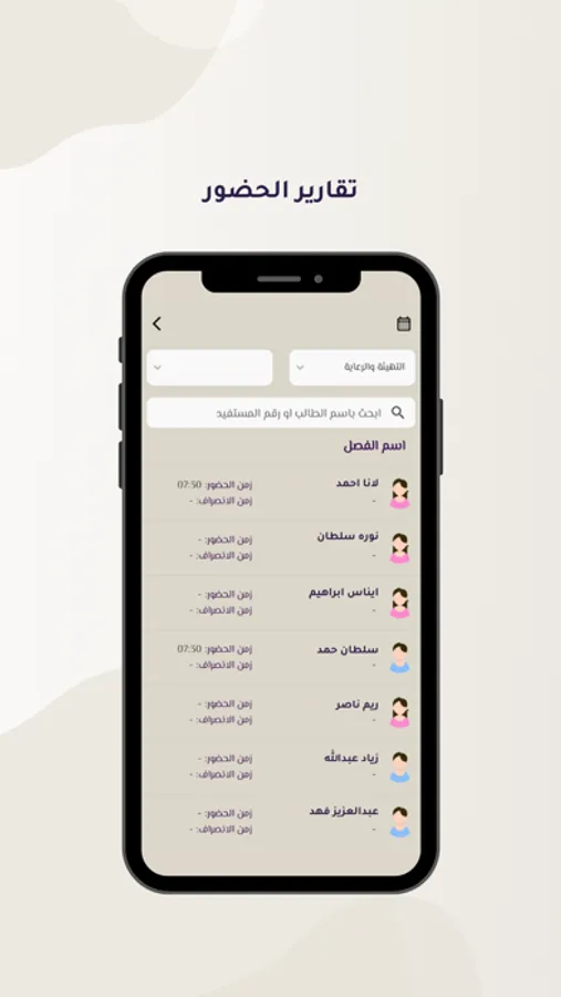 كما يمكّن من استعراض تقارير الحضور الخاصة بالطلاب ويحدد نسبة الحضور والغياب اليومي الشهري والسنوي.