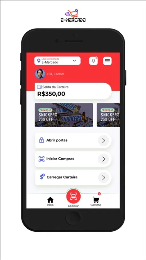 Com o aplicativo E-Mercado vai ser muito mais fácil fazer compras. Com ele, você irá ter acesso às nossas lojas simplesmente scaneando o QR code na porta de entrada através do seu celular. Para comprar, basta apontar a câmera do seu celular para o código de barras do produto desejado, confirmar o seu carrinho virtual e fazer o pagamento pelo próprio aplicativo. Seu tempo é precioso para nós.