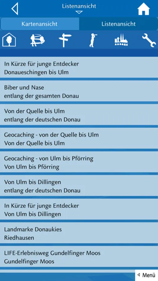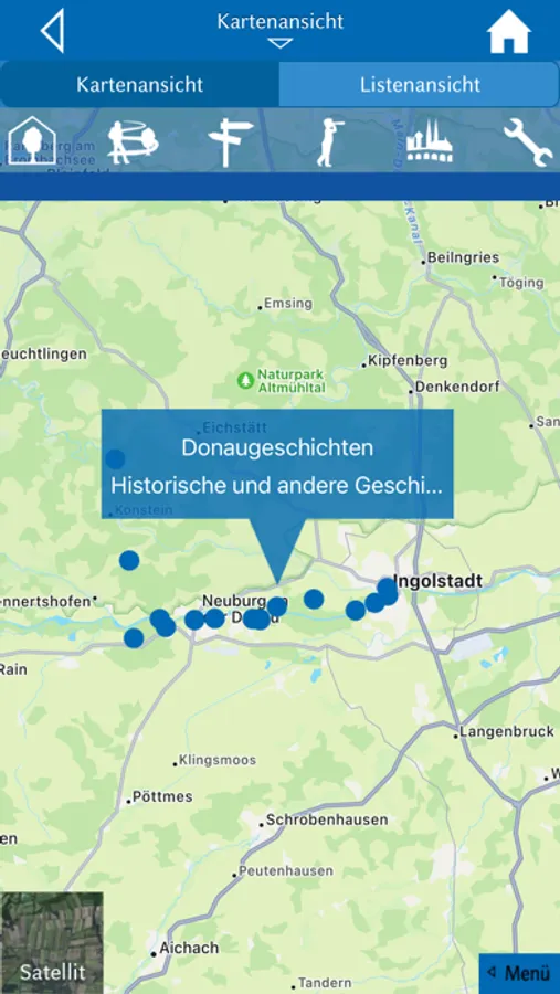 Verschiedene Sehenswürdigkeiten, Naturbesonderheiten und Aussichtspunkte können mit Hilfe der App in der Landschaft leicht aufgefunden werden. Eingespeiste Themenwege führen den Nutzer zu besonders interessanten Punkten an der Donau.