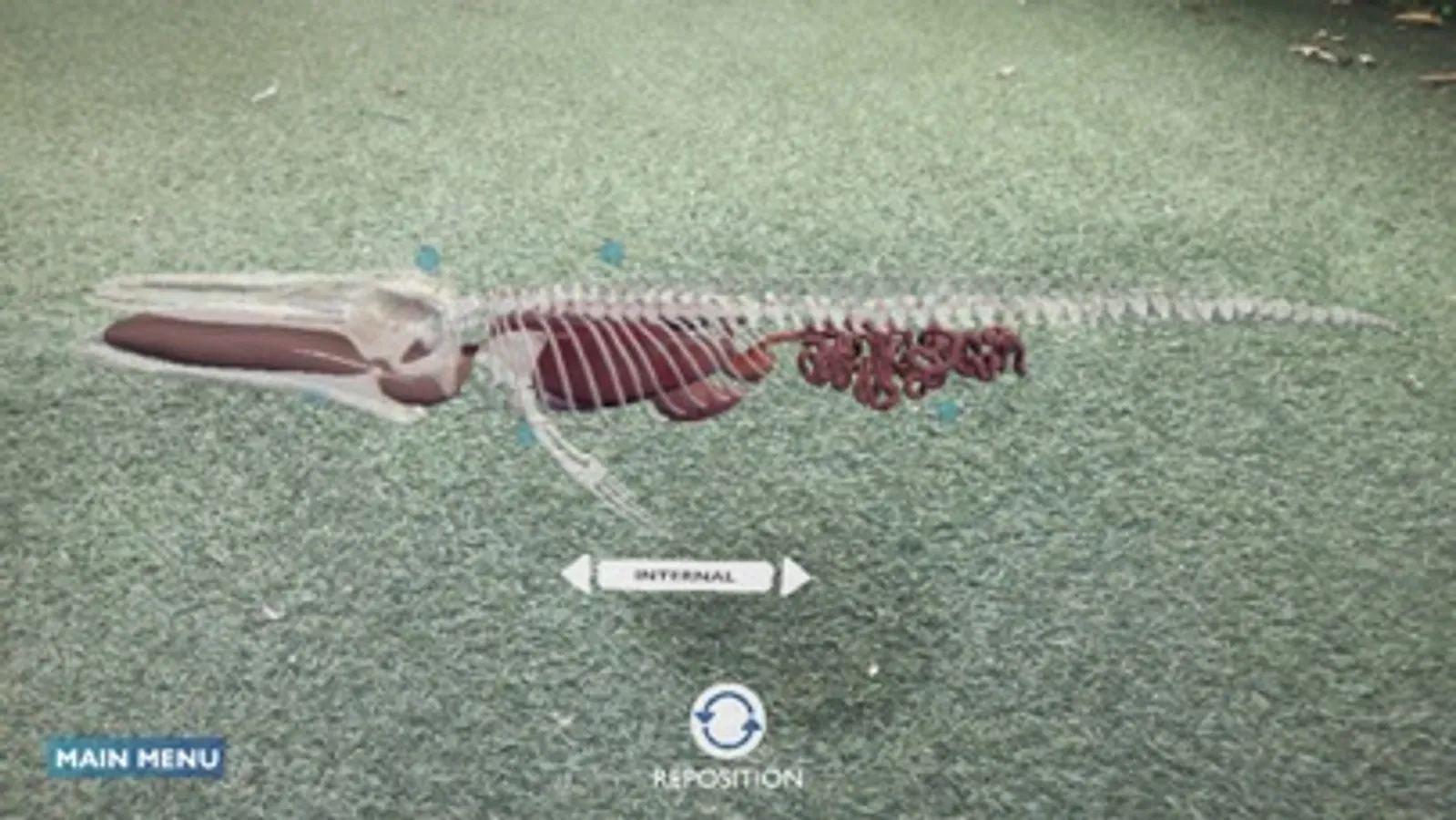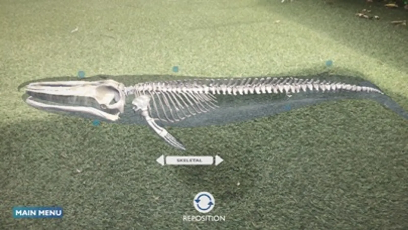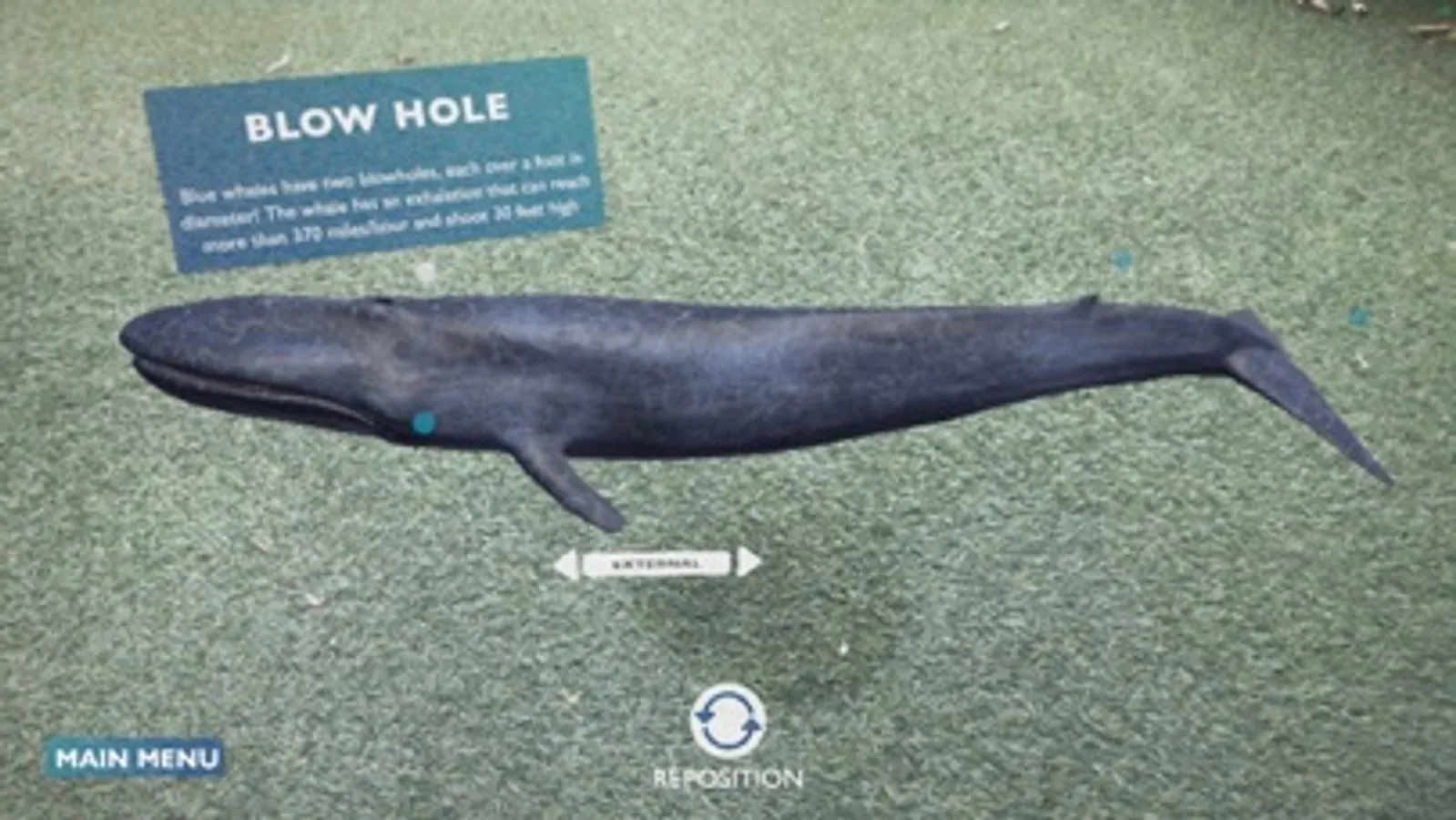 “Model View” brings you face-to-face with the whale, offering a 3D rendition you can position and explore. Find a surface to play on, then tap it to bring the whale into your world. Use the on-screen layer selector to explore the external, skeletal, and internal structures of the largest animal that ever lived. Each layer features blue hotspots that pop-up contextual information about that area of interest. You can alter the size of the whale to make it bigger and smaller, or even rotate it for a better view. Feeling adventurous? Use your fingers to expand the whale to its full size. Just make sure you have enough space!