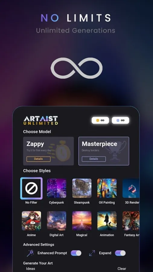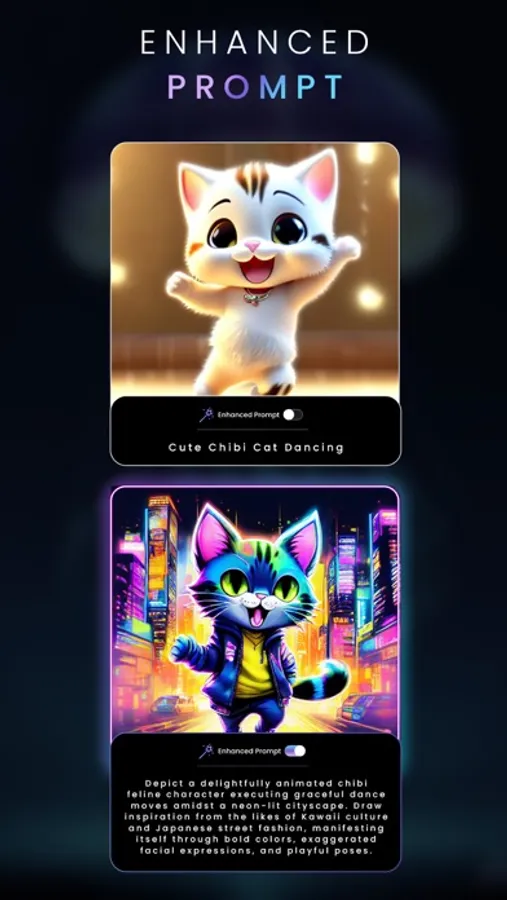Is your imagination not enough for you? We can offer more. Briefly write what you want and choose from over 100 styles. Thus, you can achieve a result in the style you want. Not enough styles? With the enhanced prompt, you can turn even a single-word prompt into a work of art.