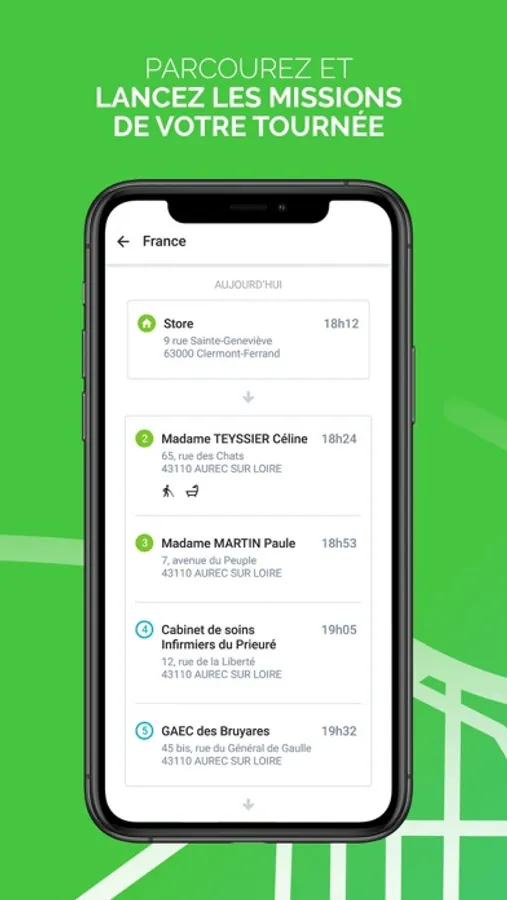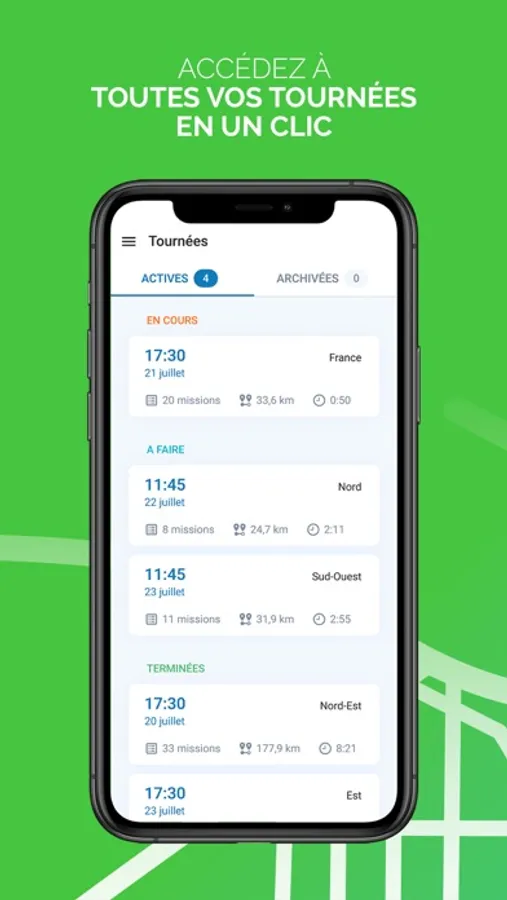 - Gestion et suivi de vos tournées avec un accès immédiat aux plan de tournées à exécuter ainsi que le détail de chacune des missions de livraison ou de visite.