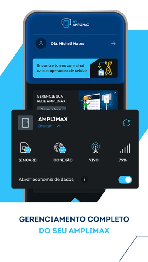 O My Amplimax foi desenvolvido para que você tenha total controle da família AMPLIMAX tudo na palma da sua mão, com ele você pode utilizar as funcionalidades do Amplimax que está acostumado a fazer no portal web do mesmo, além de ter todas informações do seu Amplimax nas suas mãos, fora isso também contamos com features de teste de velocidade de internet e a capacidade de você localizar as torres de sinal das operadoras mais próximas de você.
