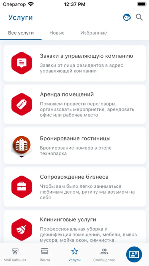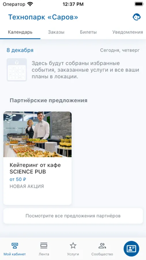 · пользоваться общедоступными услугами технопарка, заказывая их прямо из приложения (аренда помещений, услуги кейтеринга и пр.)