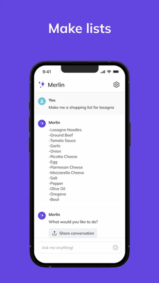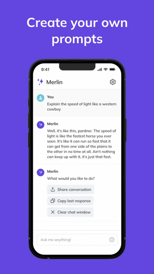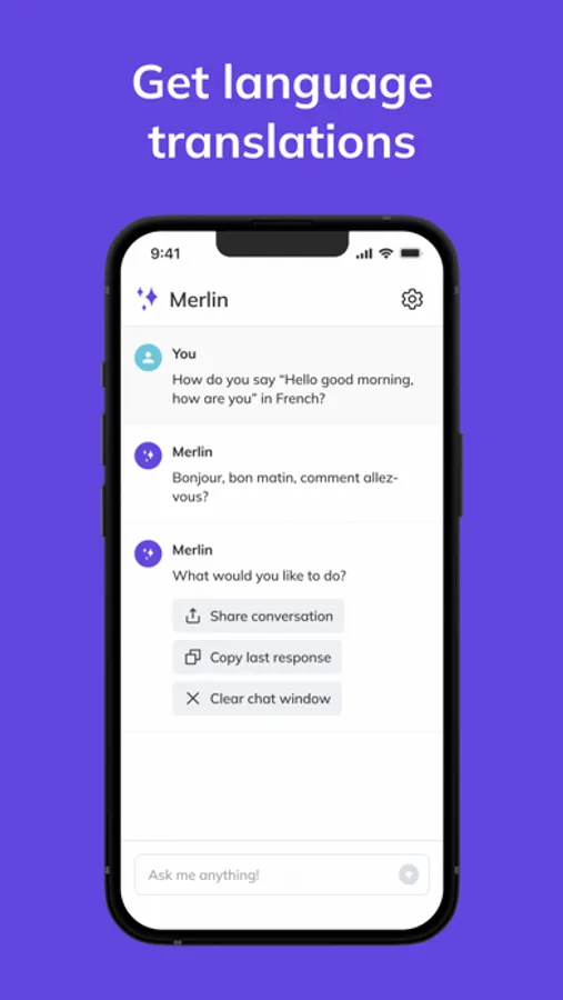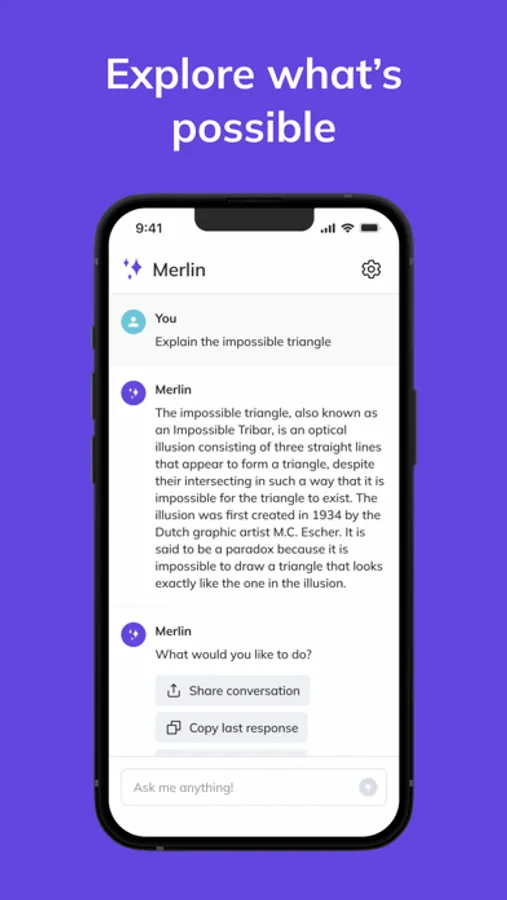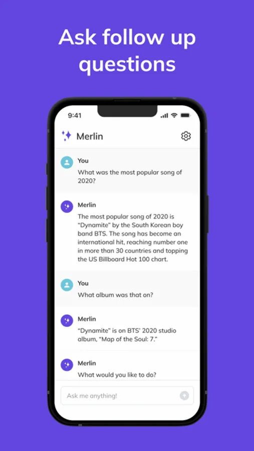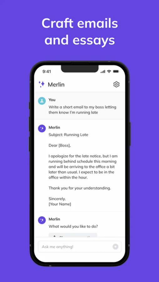 Ask Merlin anything! Merlin is the world's most powerful AI Chatbot. The AI-powered chat bot allows you to engage in virtual conversations, find answers to the world's most complex questions, create captivating stories as well as speed up your productivity to new heights. Merlin AI is integrated with the "Davinci" AI model, the most powerful LLM conversational AI chat technology.