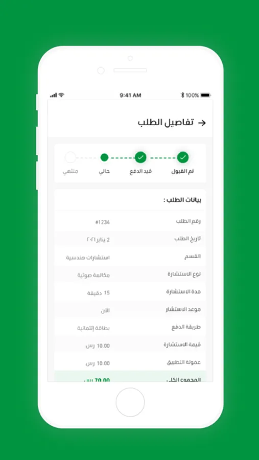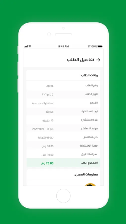 عبارة عن تطبيق وسيط لتقديم خدمات الاستشارات في الجهات المتعددة (الهندسي - القانوني - المكتبي - الاسري - المالي - الرياضي - الطلب - التوريد للكوفيات والمطاعم - محاسبة - تواصل خدمي) ، ويقوم المستخدم بالتسجيل في التطبيق واختيار نوع الاستشارة حسب الاقسام المعروضة اختيار المستشار بناء على التخصص وبروفايل المستشار وارسال طلب الاستشارة ، وعند قبوله والدفع يتم اجراء محادثة لاستكمال الاستشارة .