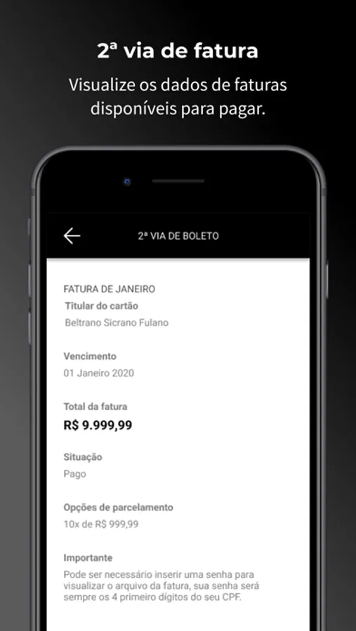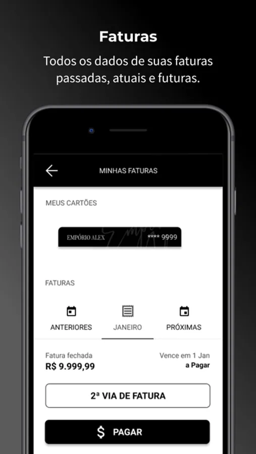 • Ver detalhes das faturas e gerar boleto para pagá-las;