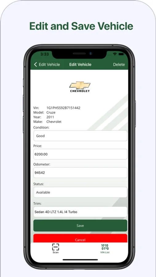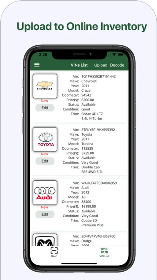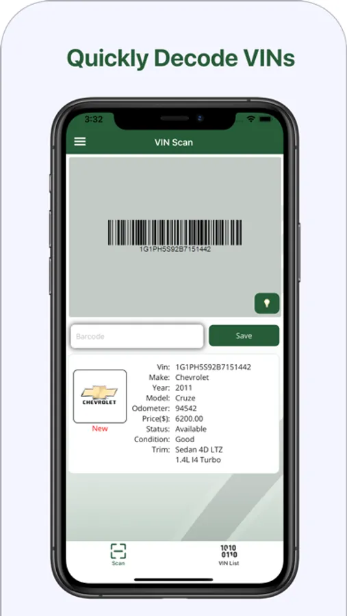 Scan or enter a vehicle's VIN to quickly decode and add to inventory, or query existing inventory records. App can scan VIN bar codes, decode VINs and add vehicles to your online inventory.