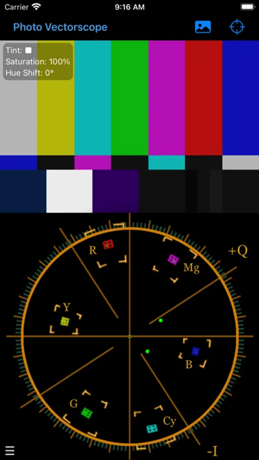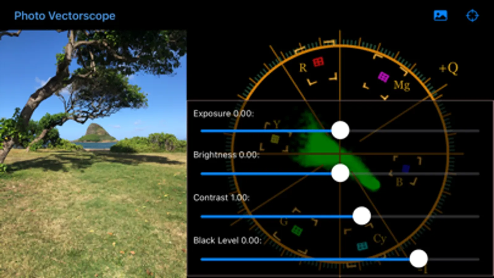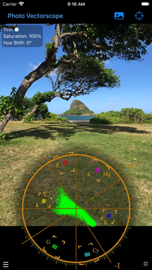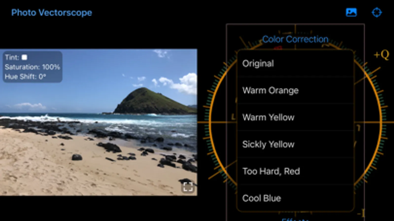 Use gestures; pinch, zoom, rotate, and drag to; desaturate, saturate, change hue, and tint an image. Brightness controls are found on the lower left of the screen.