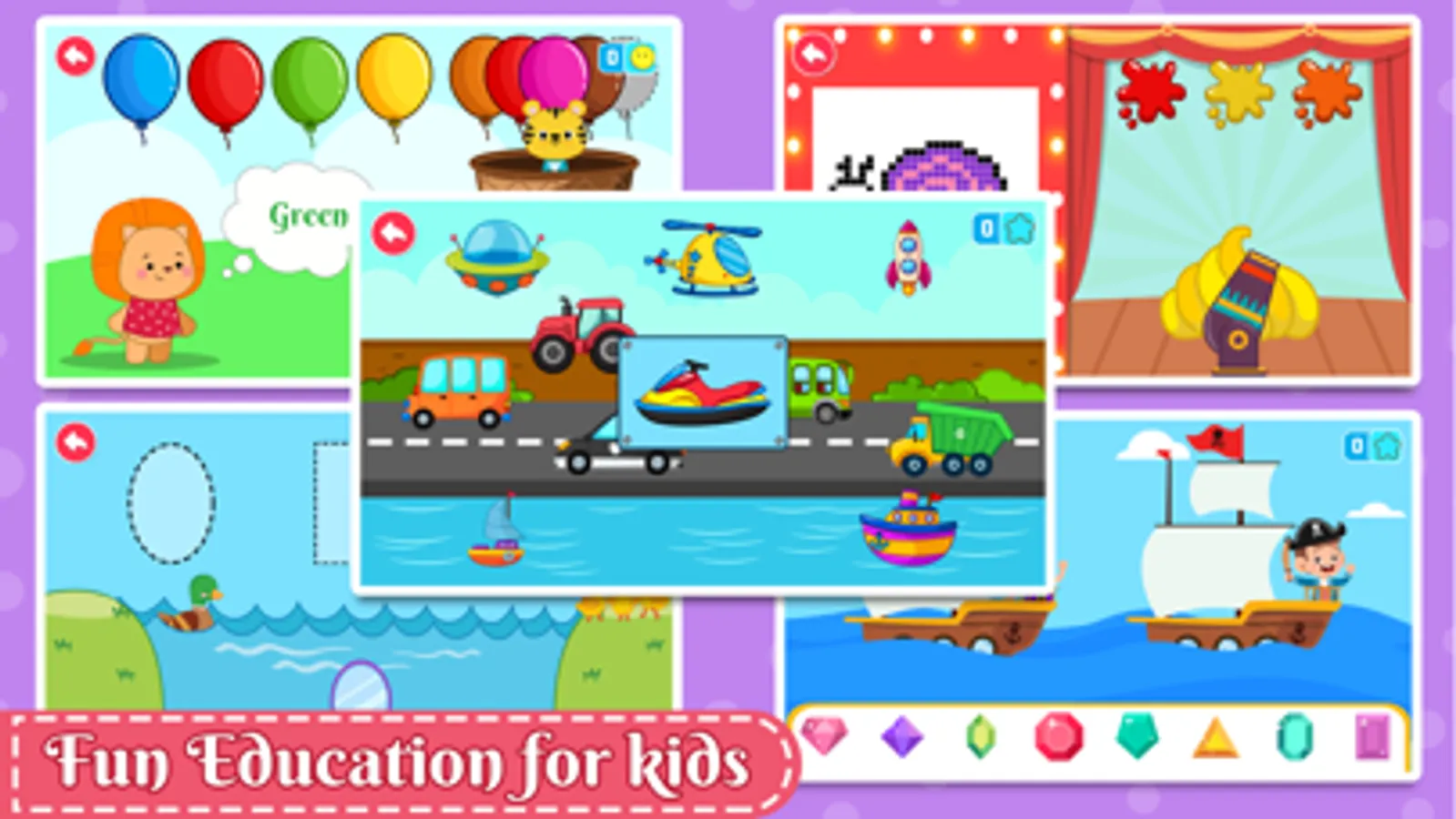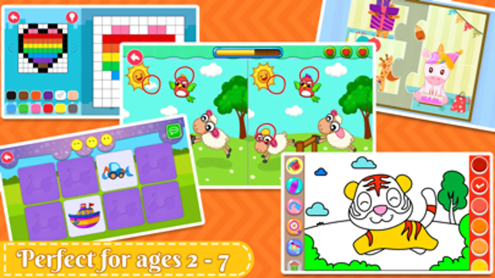 - These specially designed toddler games, feature baby games like Learn Alphabets, Spellings, Numbers, Maths, Colors, Shapes, Vehicles, Animals, Fruits & Vegetables, Body parts, Days and Months, Coloring Book, Puzzles for kids, Jigsaw Puzzles, Pixel Art, Find Difference, Memory games and many more learning games for kids.