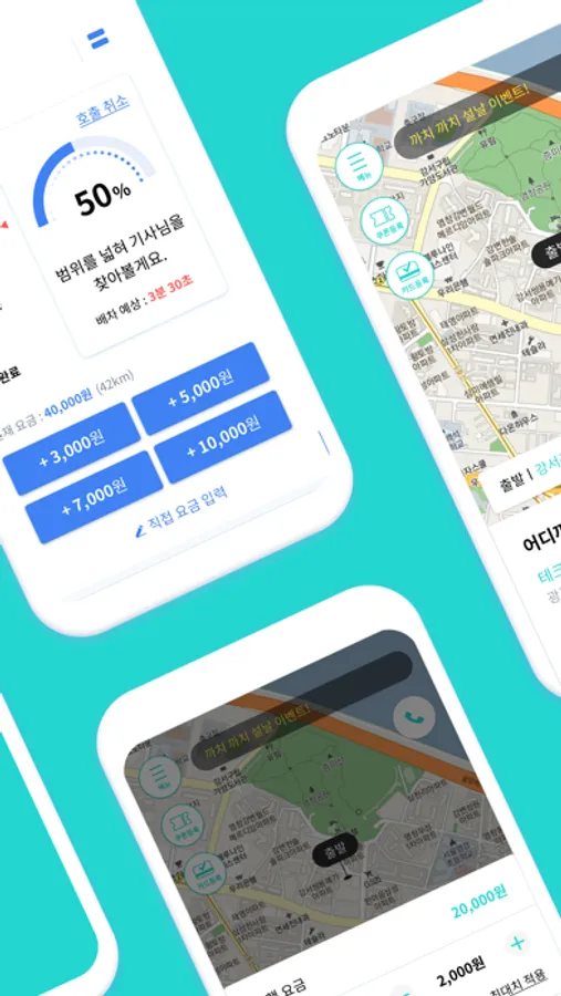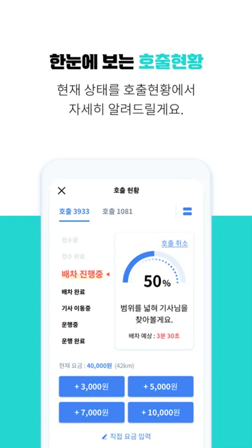 3) 요금 산정: 최적의 로직으로 빠르게 배차될 수 있는 가장 합리적인 가격을 제시합니다. 물론 요금은 스스로 조정할 수도 있습니다.