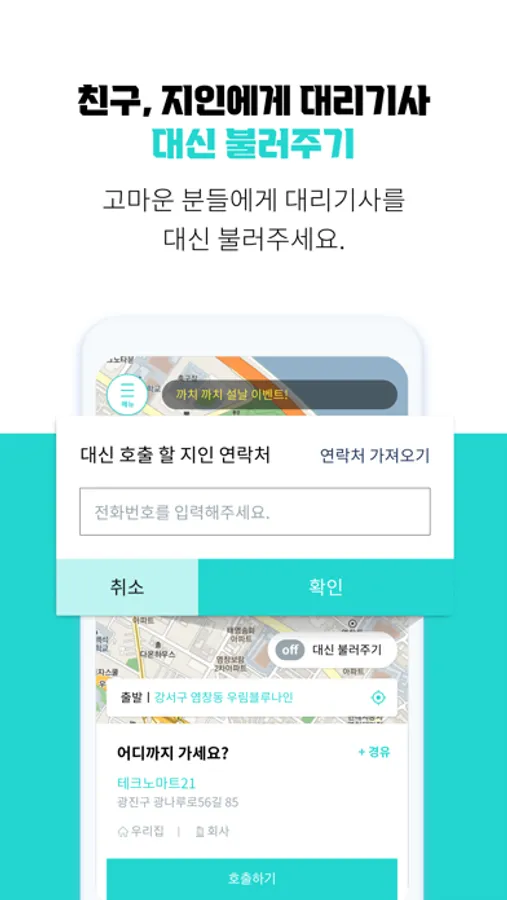 2) 대신불러주기: 친구나 지인의 대리운전 기사를 대신 호출(결제 포함)하는 기능을 제공합니다. 동시에 여러 건을 대신 불러줄 수 있기에 술자리에서 음주운전을 막아주는 멋진 사람이 될 수 있습니다.