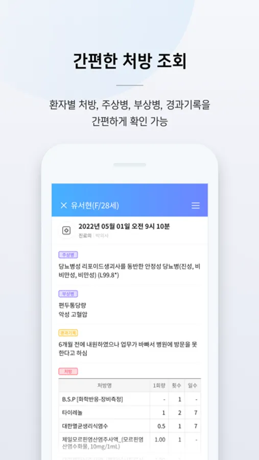 환자의 날짜별/상병별 진료기록과 처방리스트를 조회