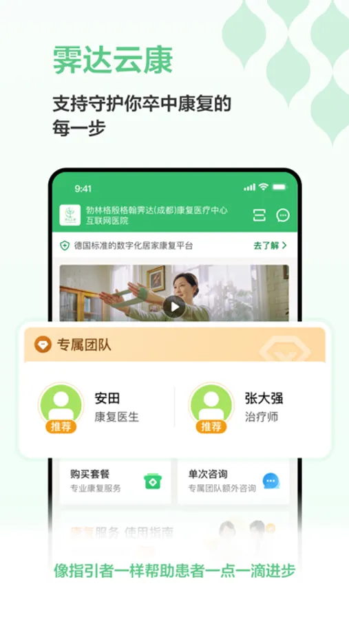 本软件为德国标准主动式线上卒中康复医疗服务平台,为轻度及中度卒中患者及家属提供康复训练及康复知识的帮助,也为医生的工作提供支持。引入德国康复理念和康复各阶段目标,创新居家康复训练模式,通过数字化的手段管理康复进程,提供给患者个性化定制主动式康复训练计划,并且通过1对1服务提高患者依从性。