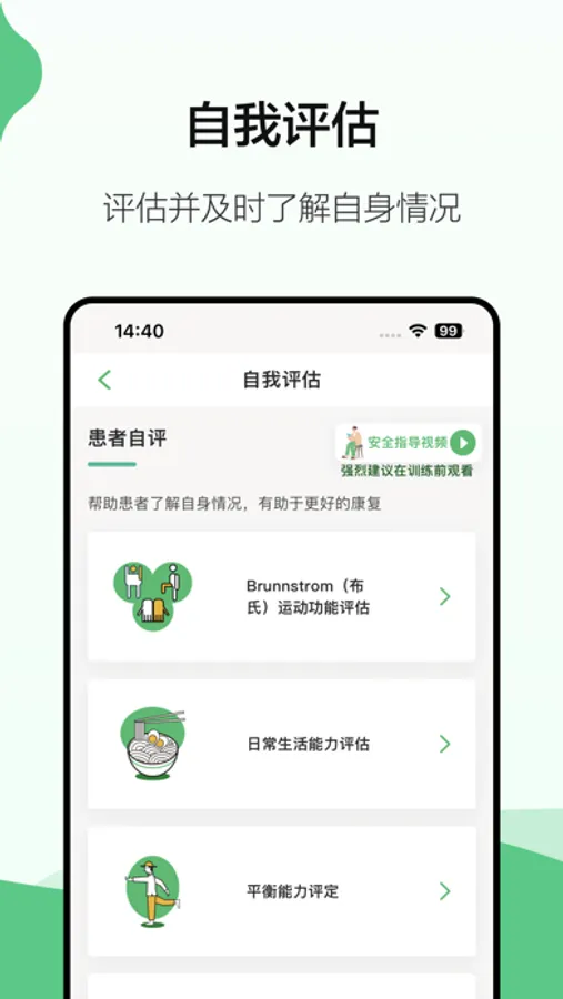 本软件患者端由脑卒中患者或其家属使用,具有以下功能:患者管理、康复训练、视频咨询、在线评估、患者教育和精神健康模块。