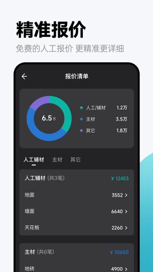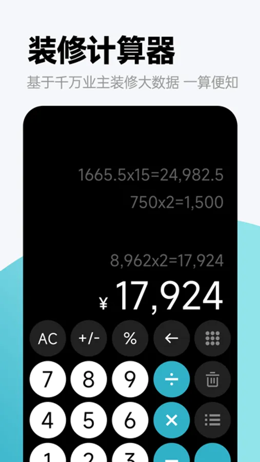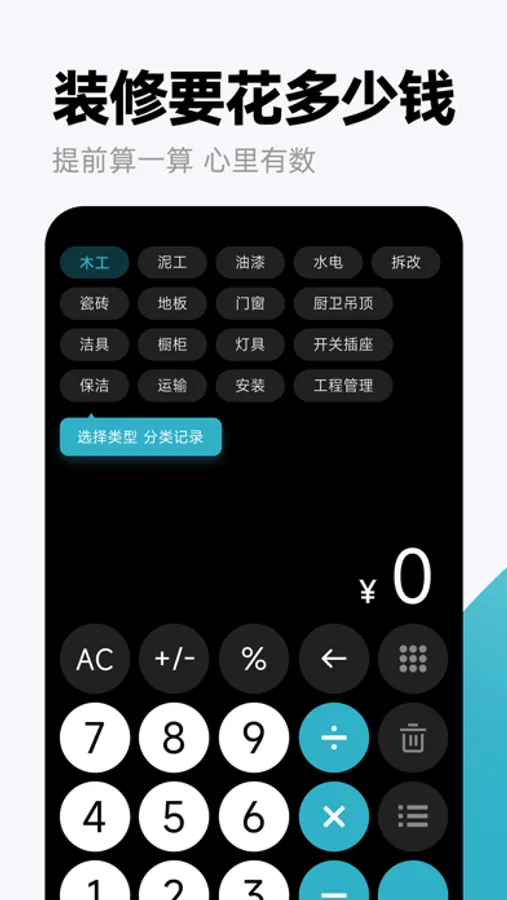 到底选购多大规格的墙砖或者地板才能完成局部装修,输入空间尺寸和你想要的材料规格,帮你计算每一项材料总价,分项预算更精细,让装修更有把握。