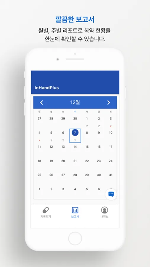 2. 리포트 : 복약 기록의 주간, 월간 추이를 확인할 수 있습니다