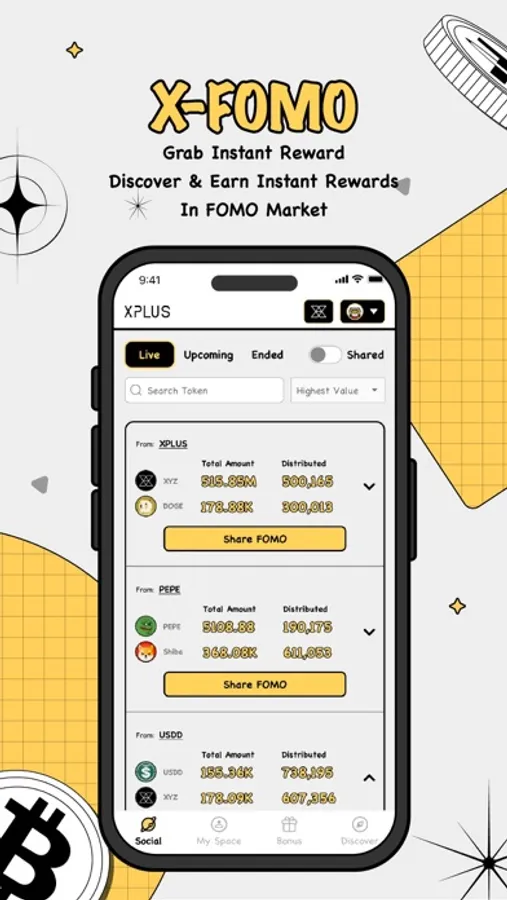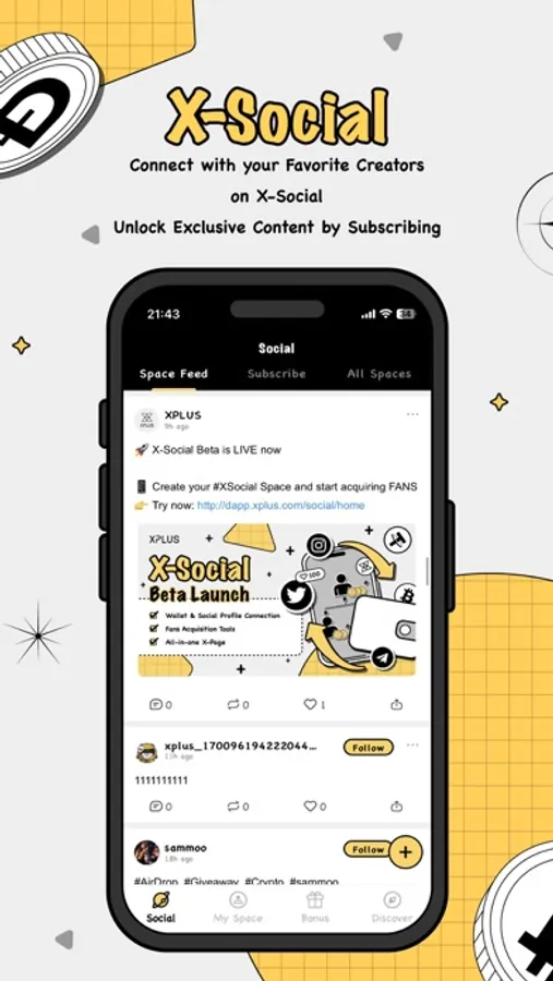 XPLUS helps you to connect the decentralized network and manage your crypto funds with ease. Get X-Bonus and participate in FOMO campaigns to maximize your social experience and mining rewards.