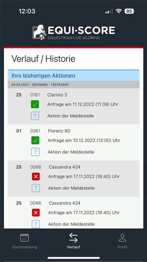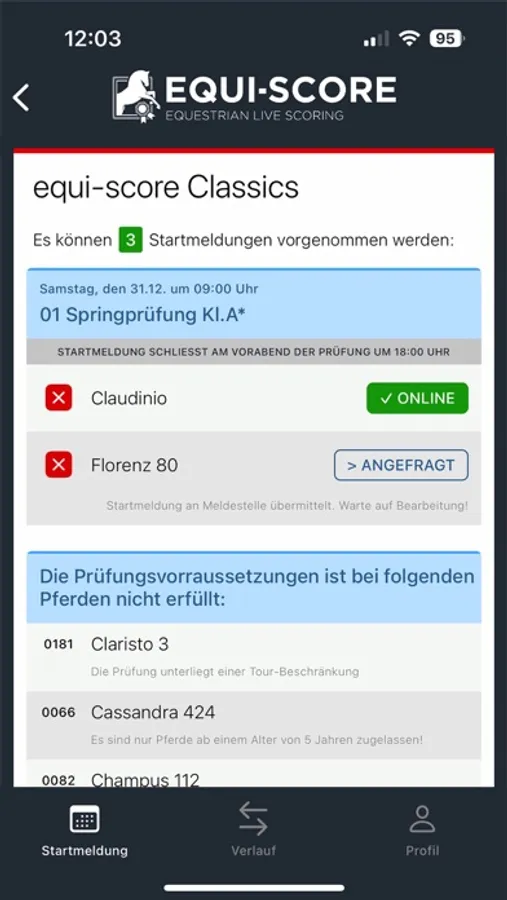 As soon as you have been activated by a show office after you've done your entries, you can register here with your access data, e.g. FN number / date of birth or FEI ID / date of birth and by a simple click you can tell the show office which horse you want to start with.