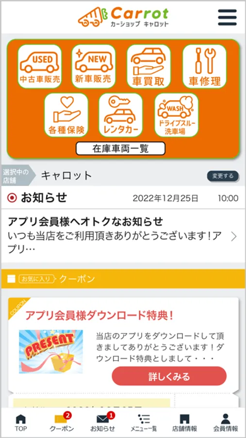 当社の公式アプリ「ドライブスルー洗車 カーショップ キャロット」ではアプリで洗車サービスのご利用が可能の他、当店で利用いただけるお得なクーポンや各種メニューの割引情報を配信しております。